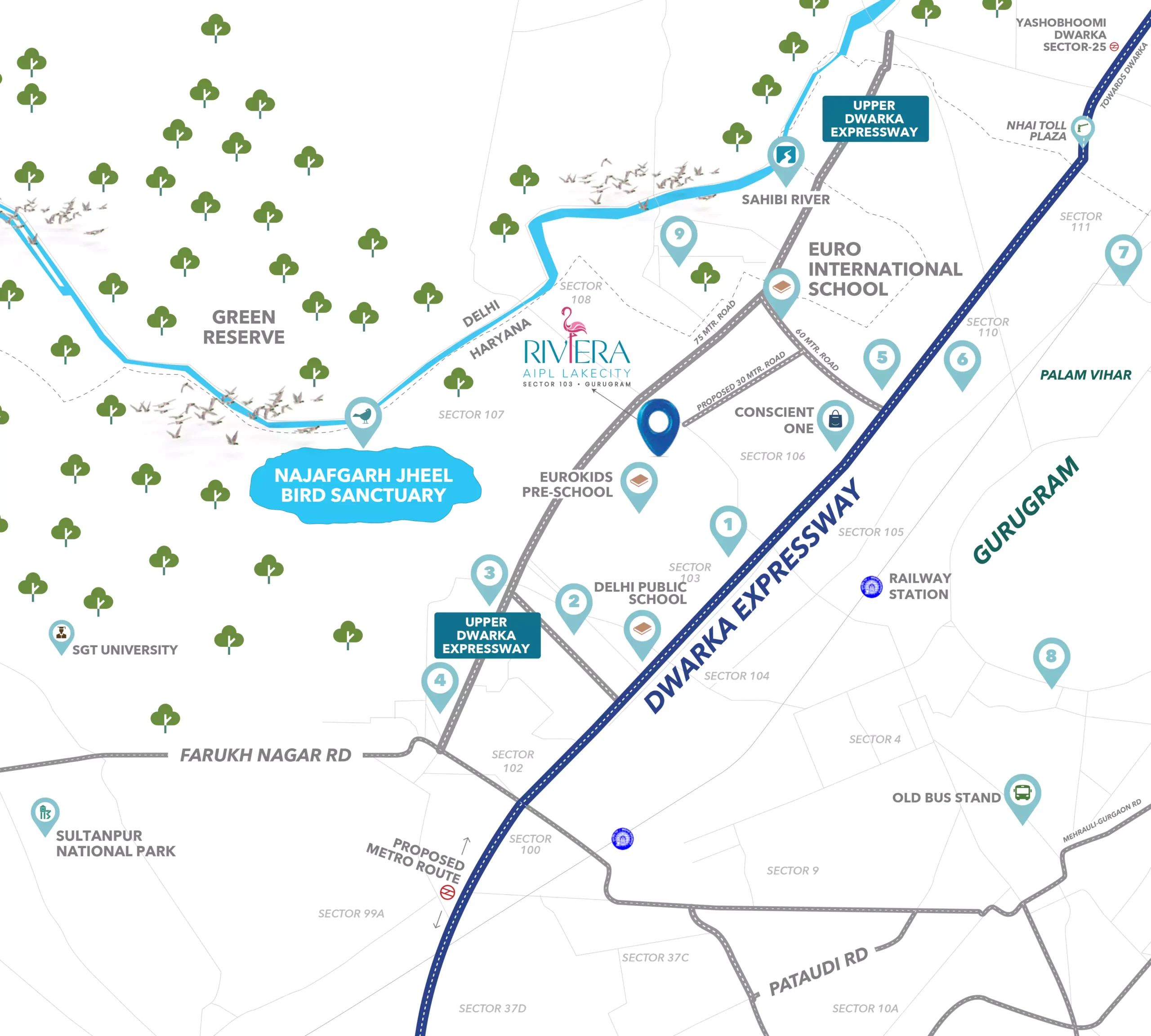 Located in Sector 103, Gurgaon, AIPL The Riviera Lake City enjoys excellent connectivity to the proposed metro corridor, leading hospitals, renowned international schools, and prominent retail and entertainment destinations. At the heart of the community lies the exclusive Riviera Clubhouse—a vibrant social hub offering refined leisure spaces, celebration zones, and wellness-focused amenities designed to enrich everyday living.